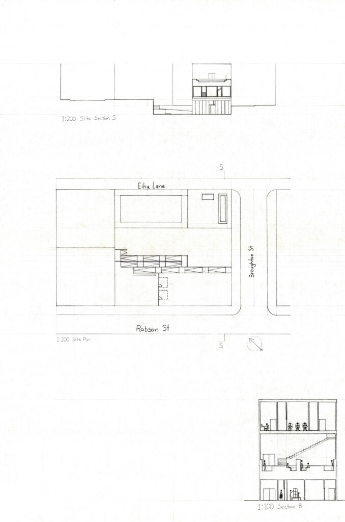 This project expanded into the public realm with a bathhouse and landscape at Robson and Broughton in downtown Vancouver. I drew inspiration from Nordic spas and organized the program around the cycle Hot → Cold → Relax.