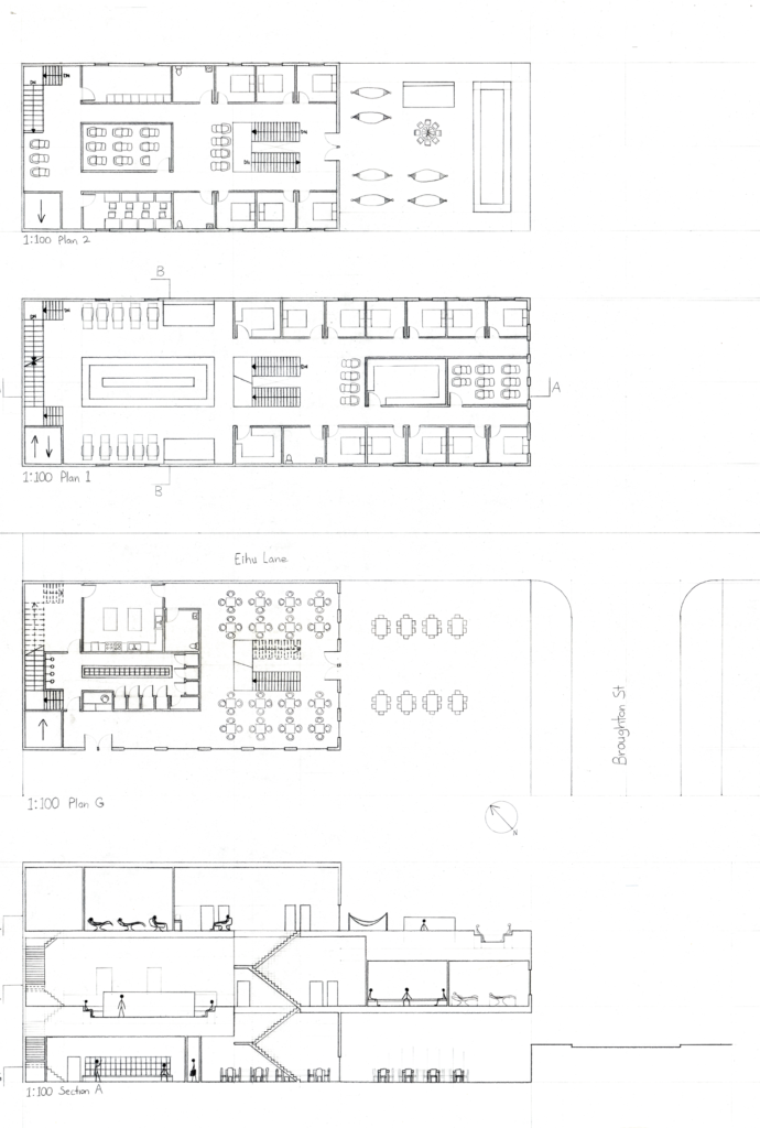 Hot pools, a sauna, and a steam room kicked things off. Cold plunge pools provided contrast. Finally, a salt cave, lounge chairs, and resting rooms offered spaces to unwind. A café anchored the social side of the project, while the site’s edge included bike parking, public washrooms, and an open grass park. Everything was hand-drawn on vellum, supported by physical models.