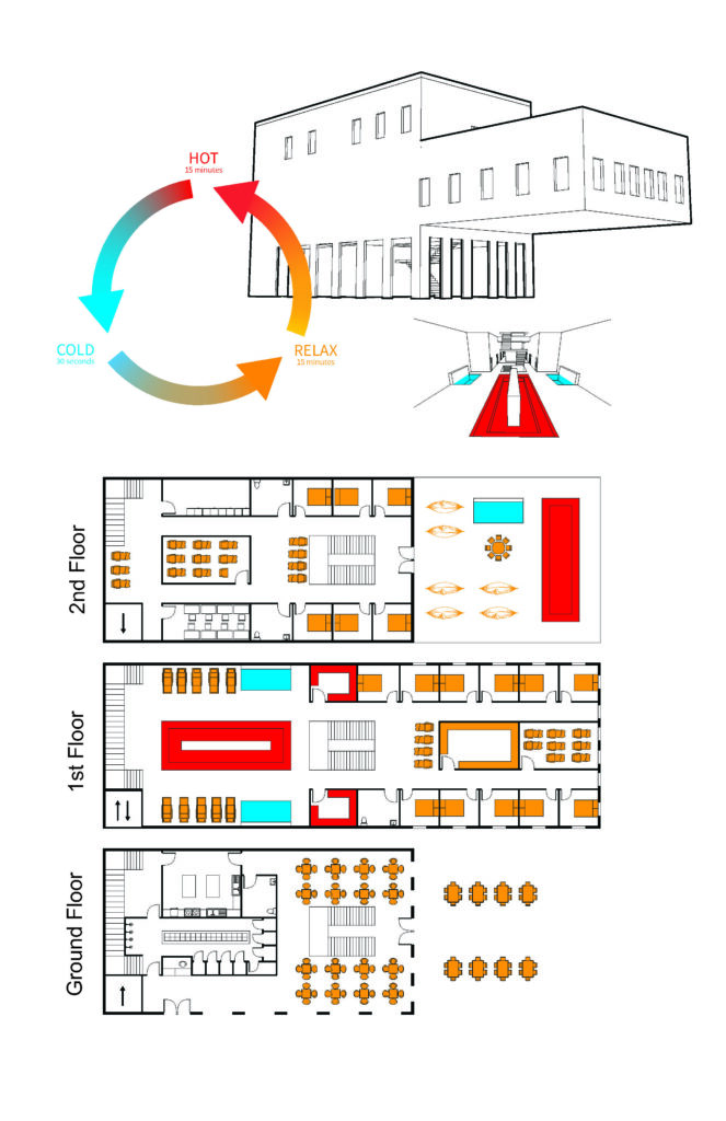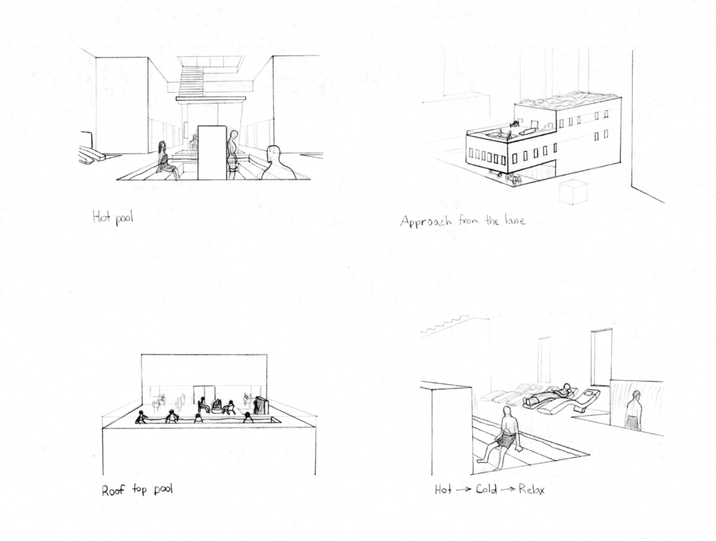 In parallel, we were asked to create a narrative drawing that captured something our regular plans and sections couldn’t. For the bathhouse, I visualized the Hot → Cold → Relax cycle as a spatial sequence.