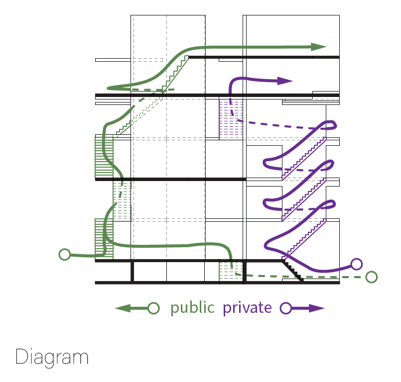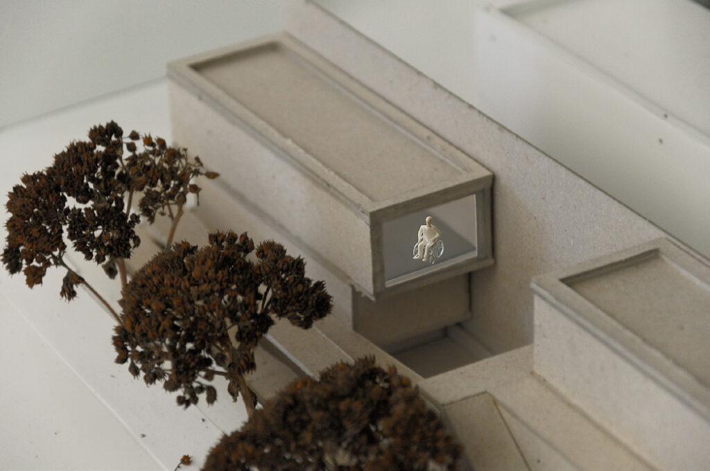 Jeffries needed ramps for his wheelchair, while Shige needed her own private quarters. I imagined them running a shared magazine photography business: Shige styling clients in her salon downstairs, then sending them upstairs to Jeffries’ studio. The two domains met in a courtyard — part waiting area, part social threshold. It was a fun way to translate character studies into architecture.